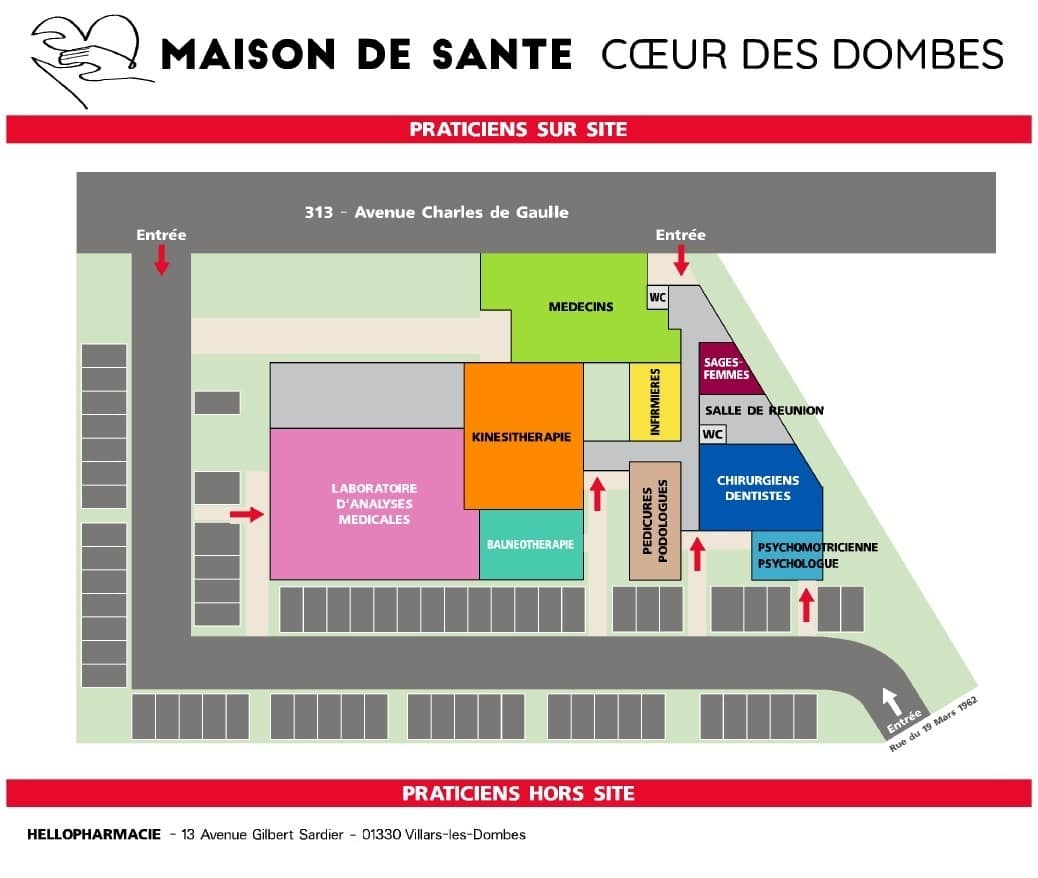 Le bâtiment principal accueille également la Maison Médicale de Garde Dombes-Côtiere qui assure les consultations de soins non programmés les week-ends et les jours fériés. Appeler le 15 au préalable.